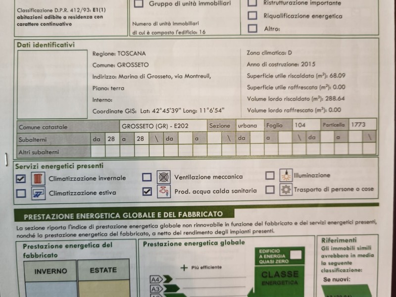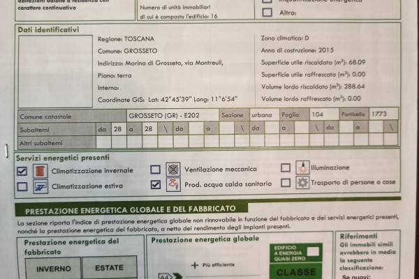 A 500 metri dal mare, a Marina di Grosseto, proponiamo in vendita uno splendido piano rialzato di nuova costruzione, pronto per essere abitato. L'immobile unisce design moderno e massima efficienza energetica. L'ingresso si apre su un accogliente disimpegno che conduce al cuore della casa : un ampio soggiorno open space con cucina a vista, caratterizzata da un' eccezionale luminosità naturale. Da qui si accede al grande balcone abitabile di 15 mq, uno spazio perfetto per pranzi o cena all'aperto o per rilassarsi dopo una giornata di mare. La zona notte è composta da un' ampia camera matrimoniale , una camera doppia e un bagno rifinito con cura con doccia e balconcino privato. Completa la proprietà un comodo garage di 18 mq collegato al piano dell'appartamento tramite ascensore, una rarità fondamentale in una località balneare. L'appartamento è in classe energetica A/2 con pannelli solari e cappotto termico. Autoclave condominiale. Riscaldamento centralizzato a gas.